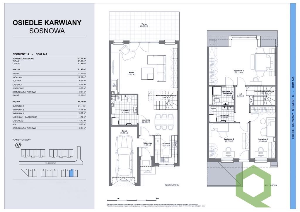 Dom znajduje się w ostatnim etapie osiedla (21 domów) przy ul. Sosnowej w Karwianach. Daje to gwarancję zastałej przestrzeni w około przyszłego domu. Osiedle jest bezpiecznym miejscem dzięki zamontowanej bramie wjazdowej. Dom oddawany w standardzie deweloperskim.