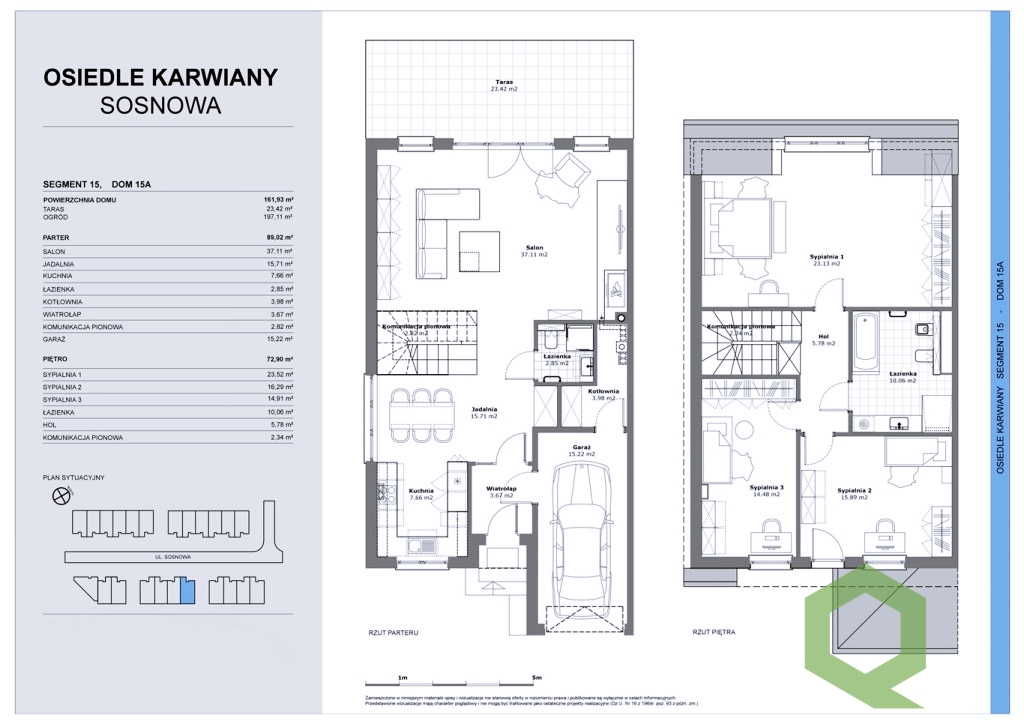Dom znajduje się w ostatnim etapie osiedla (21 domów) przy ul. Sosnowej w Karwianach. Daje to gwarancję zastałej przestrzeni w około przyszłego domu. Osiedle jest bezpiecznym miejscem dzięki zamontowanej bramie wjazdowej. Dom oddawany w standardzie deweloperskim.
