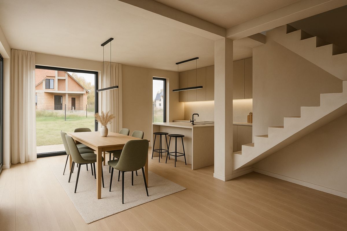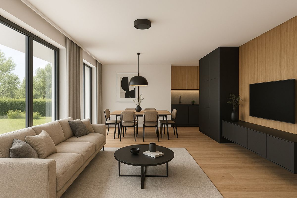 Dom o powierzchni użytkowej ok. 151m2 został zaprojektowany z myślą o komforcie i estetyce. Budynek wyróżnia się dużymi przeszkleniami, dzięki którym wnętrza są pełne naturalnego światła, oraz nowoczesną architekturą łączącą funkcjonalność z elegancją.