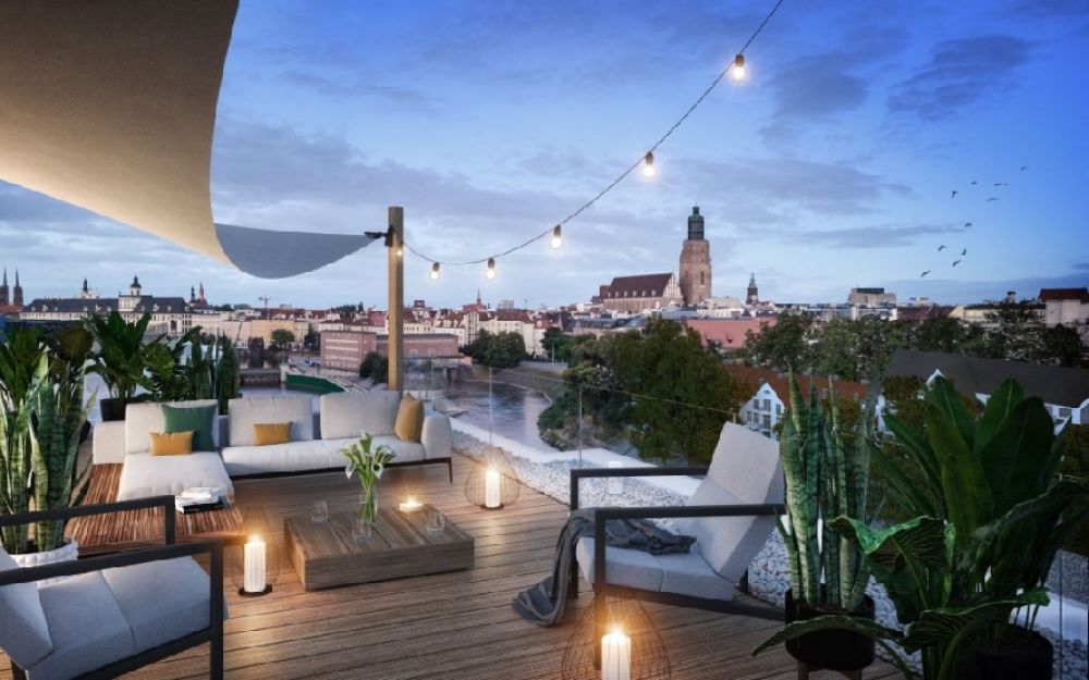 Błyszcząca elewacja, wykonana w nowoczesnej technologii, w połączeniu z zielonymi tarasami zapewni nowatorskie rozwiązania asymilujące z sąsiedztwem rzeki Odry.